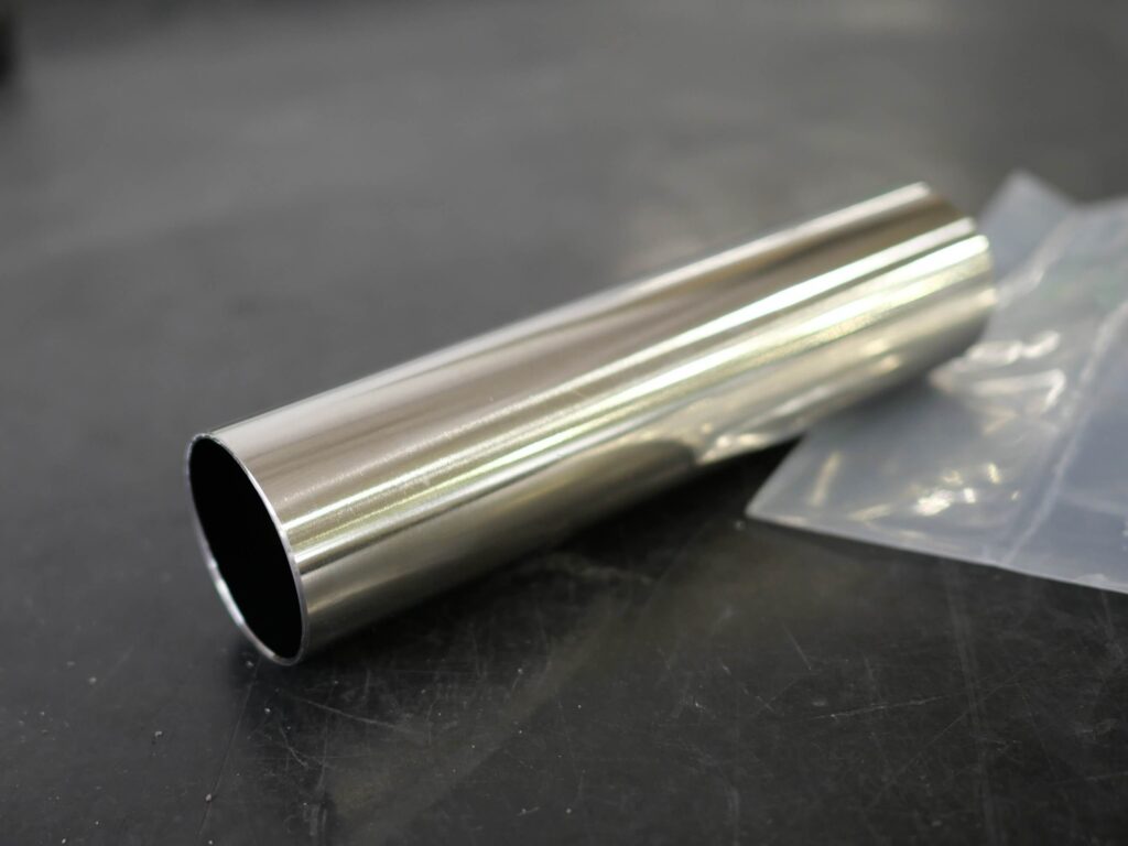 ステンレスパイプを角度45度で斜め切断した事例です。写真は内面#400研磨後斜め切断した物になります。